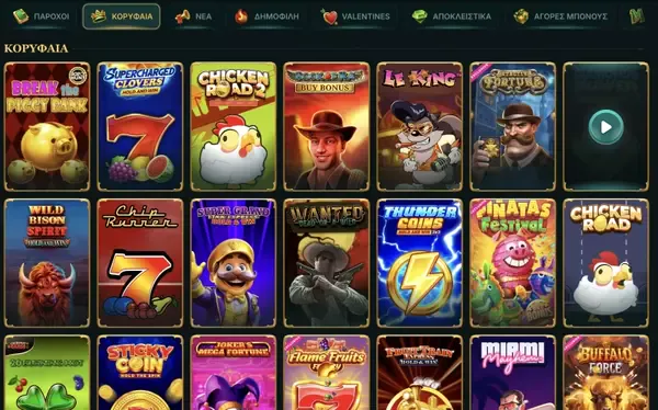 Το lobby μας περιλαμβάνει περίπου 4.000 παιχνίδια καζίνο σε Slots, Live Casino, Table Games και Jackpots. Συνεργαζόμαστε με γνωστά studios όπως Evolution, Pragmatic Play, Play'n GO, NetEnt, Red Tiger, Microgaming, NoLimit City, Yggdrasil, Spinomenal και Relax Gaming. Πολλά φρουτάκια στον κατάλογό μας ξεπερνούν 96% RTP, και μπορείτε να ελέγχετε τις λεπτομέρειες RTP στο πάνελ πληροφοριών του παιχνιδιού.