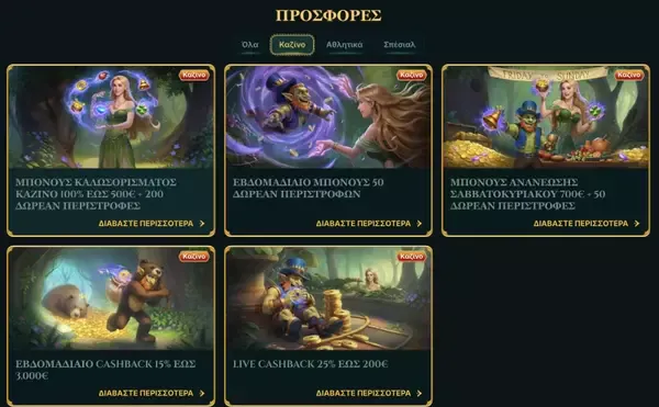 Μετά την πρώτη σας εβδομάδα, οι προωθήσεις μας παραμένουν ενεργές με τακτικά προγράμματα. Το Weekly Reload δίνει 50 δωρεάν περιστροφές στην πρώτη κατάθεση της εβδομάδας, και το Weekend Reload Bonus δίνει 50% έως €700 συν 50 δωρεάν περιστροφές. Αν σας αρέσει ο ανταγωνισμός, μπορείτε να συμμετέχετε στο Slot of the Week, σε εβδομαδιαίο Live Casino Tournament και σε Monthly Race με prize pool 2.500 coins.